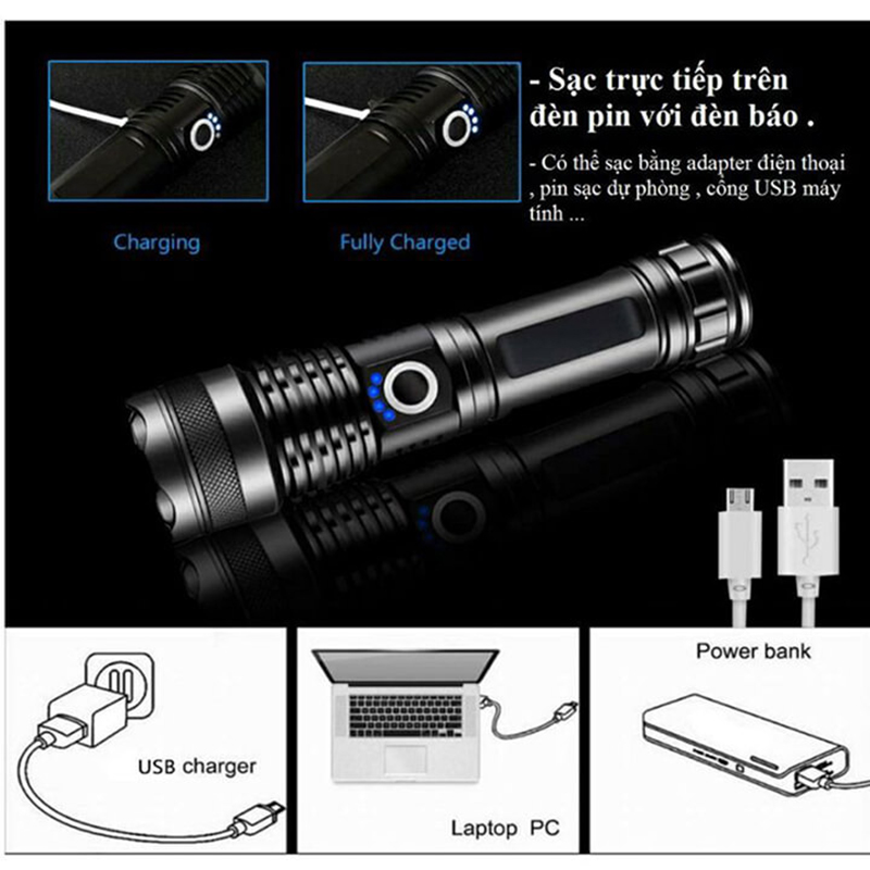 - Bộ Đèn pin siêu sáng XHP50 tích điện dung lượng lớn cho thời gian chiếu sáng lâu hơn
