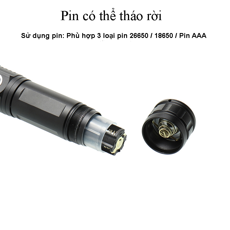 - Đèn pin cầm tay siêu sáng XHP50 dùng Pin AAA, Pin 18650 hoặc pin 26650 Dung Lượng Cao phù hợp với từng nhu cầu của khách hàng