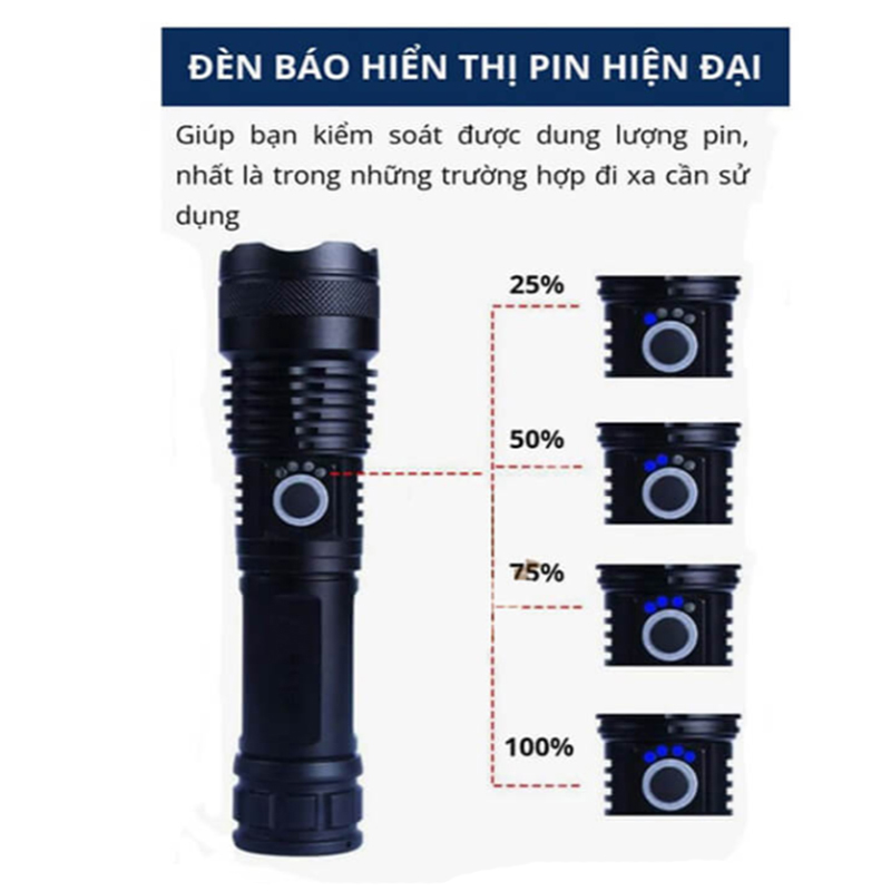 Nếu bạn đang tìm một Đèn pin cầm tay siêu sáng ở mức giá tầm trung mà vẫn nhiều công dụng và bền bỉ thì chiếc đèn XHP50 là một lựa chọn đúng đắn. Bảng mạch của đèn pin được thiết kế với: bảo vệ kết nối ngược pin, bảo vệ quá tải và quá tải. Thiết kế sạc USB. Chiếc đèn có chức năng zoom xa gần, phần công tắc được thiết kế với đèn báo dung lượng pin ( 100% -75% -50% -25% pin) . Đèn có 5 chế độ sáng ( sánh mạnh- sáng trung bình- sáng yếu- đèn flash – nhấp nháy ). Đèn có thể dùng chiếu sáng ngoài trời, trong nhà, các công trình, đi du lịch , dã ngoại, săn bắn ...