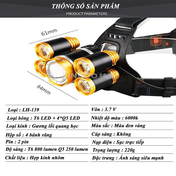 Thông số kỹ thuật: Đèn Pin đội đầu 5 bóng Led siêu sáng