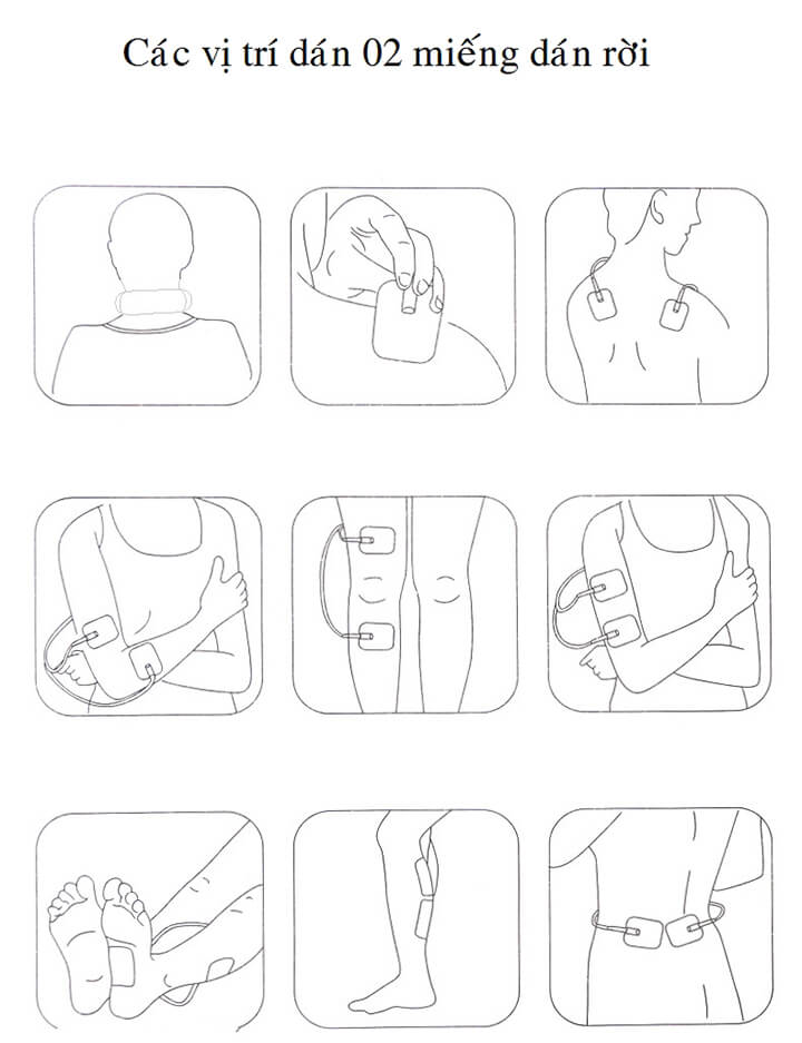 Dùng dây dẫn đi kèm gắn một đầu vào jack cắm cạnh nút nguồn, 2 đầu còn lại gắn vào miếng dán phủ gel và đắp lên các vùng cơ thể cần trị liệu: như lưng, bắp tay, bắp đùi.